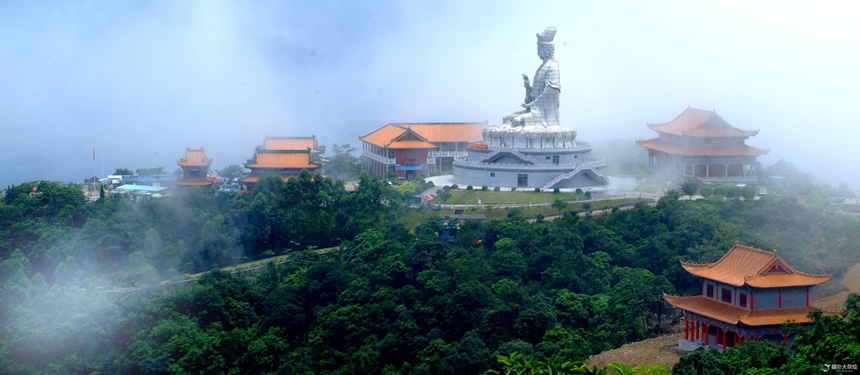觀音山園區內峰巒疊嶂,十多個主峰簇擁環繞、互競姿色,常年云霧繚繞,景色變幻莫測。大自然的神奇造化,為觀音山添設了無數自然景觀,較為壯觀的是落差380米、逶迤跌巖36級的仙泉瀑布和3999級曲徑的“佛緣路”、-松濤的“森林浴”。